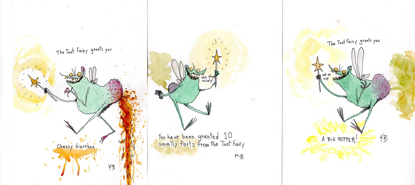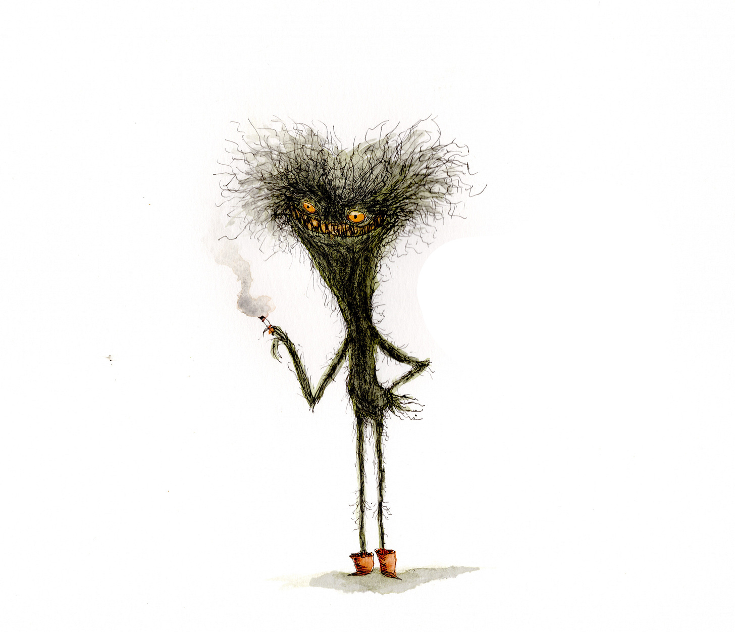 When I was young I drew funny characters and drawings of my classmates. Later in life I discovered Tim Burton’s drawings and fell in love with the free linework and inky blackness of it. During the pandemic I picked up drawing and painting again and dove into learning a style of my own. I decided I wanted to draw like Quentin Blake, Tim Burton and Ronald Searle all rolled into one. Also some William Steig. Some Kate Beaton. A lil Lee Gatlin. Dash of Richard Scarry. So on.